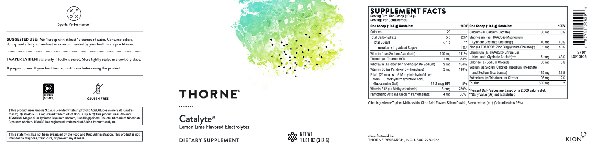 Catalyte is an electrolyte and energy restoration complex that supports muscle function and stimulates energy cellular recovery.* It's lemon-lime flavored, low in calories, and has no artificial sweeteners. Hydration and electrolyte balance are essential for all levels of exercise and athletic performance. Catalyte combines electrolytes with B vitamins, vitamin C, and D-ribose (which helps slow lactic acid build-up and stimulates energy recovery) for broad-spectrum repletion of nutrients and hydration of cells.* Catalyte is formulated with sodium in the ratio that is typically found in sweat. Its blend of potassium, calcium, magnesium, and zinc replaces the primary electrolytes lost in perspiration, while also helping muscle recovery.* To be mixed with water, it's a tasty lemon-lime flavored electrolyte supplement low in calories with no artificial sweeteners. It's perfect for before, during, and after a workout.